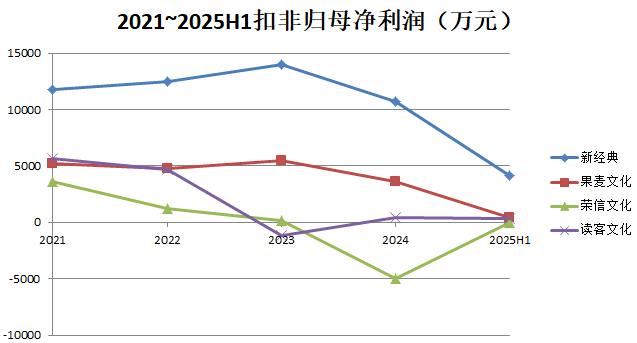 综合来看,新经典毛利率相对最高最为稳定;荣信文化稳中有升;果麦文化之前毛利率与新经典相当,2025年上半年有所下滑;读客文化在毛利率方面相对表现最差。