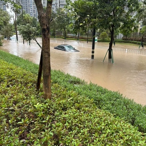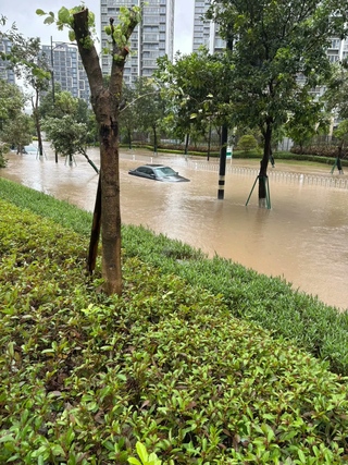目前,珠海市部分地区发生海水倒灌。24日下午18时,多位采访者告诉界面新闻,其所在小区路段水深3-5米,有车辆被淹。