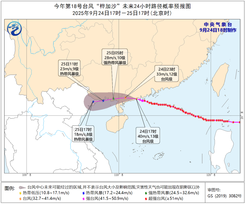 中央气象台预计,9月24日14时至25日14时,广东大部、广西中南部、福建东南部、海南岛中北部、江苏中南部、安徽中部、湖北东部、江西北部和西南部、湖南南部、台湾岛东南部等地部分地区有大到暴雨,其中,广东中南部、广西南部、江苏中部等地部分地区有大暴雨,广东沿海和西部等地局地特大暴雨。