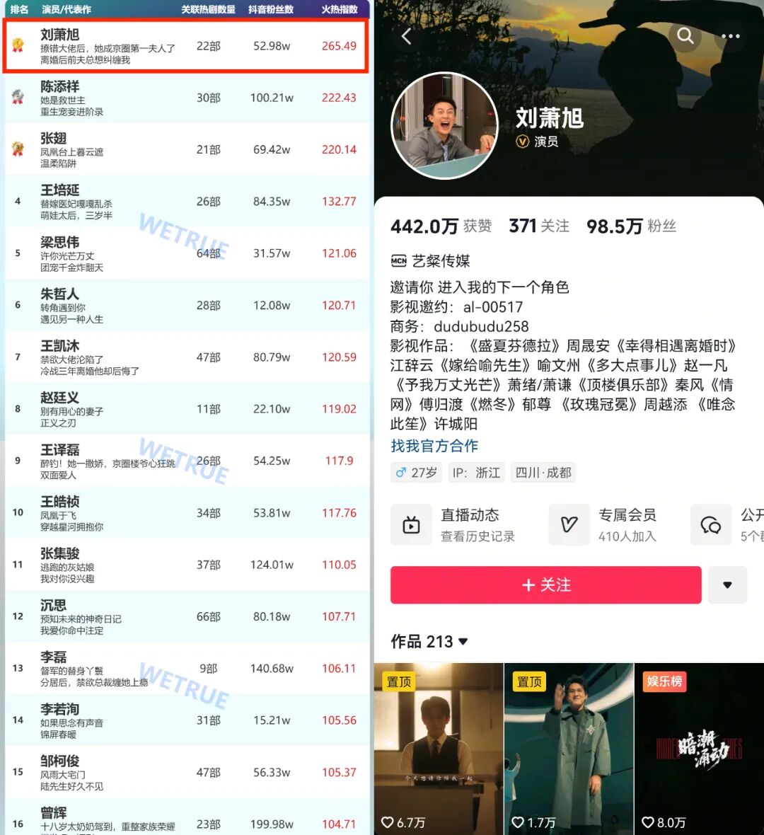 根据WETRUE统计显示,从9月18日起,刘萧旭登顶男演员榜,其火热指数甚至实现断层式领先,而在前一天(9月17日),前五十名甚至没有其身影。刘萧旭抖音粉丝也从8月29日的20万涨至9月24日近100万。