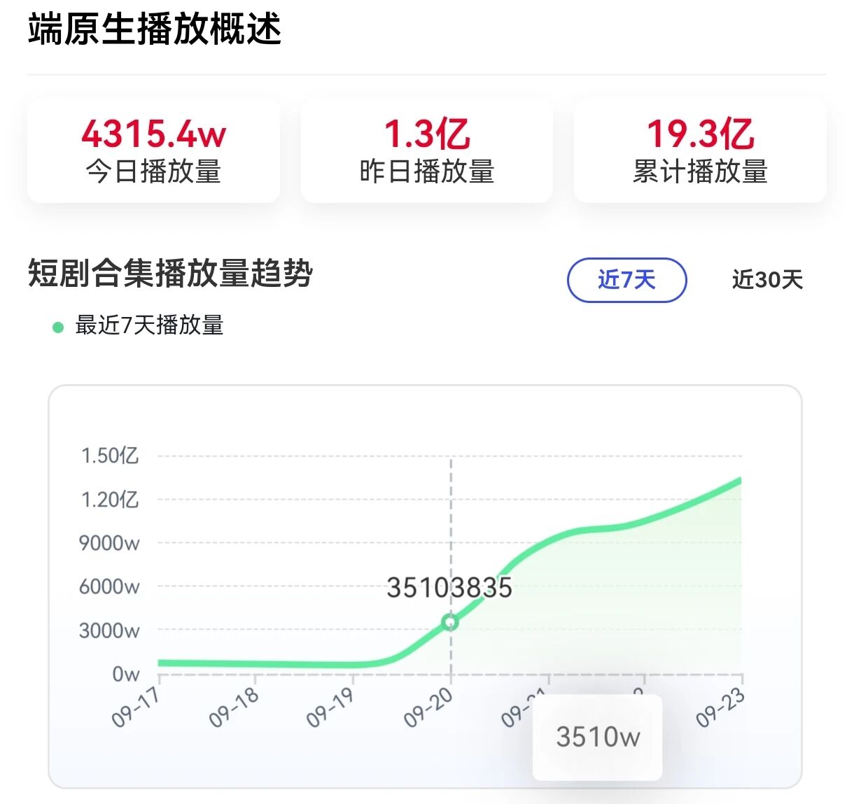 9月20日上线的《盛夏芬德拉》开播首日红果热度值就达成破亿成绩,并持续多日破亿,截至目前四天时间实现观看量破10亿。