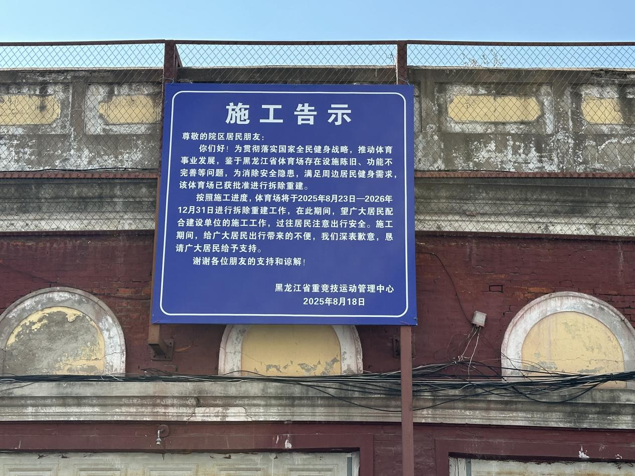 施工告示由黑龙江重竞技运动管理中心于2025年8月18日发布,指出拆除重建是为了“贯彻落实国家全民健身战略,推动体育事业发展”,同时解决“设施陈旧、功能不完善等问题,为消除安全隐患,满足周边居民健身需求”。这一决定基于该体育场已被鉴定为Dsu级危房的现状。