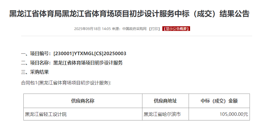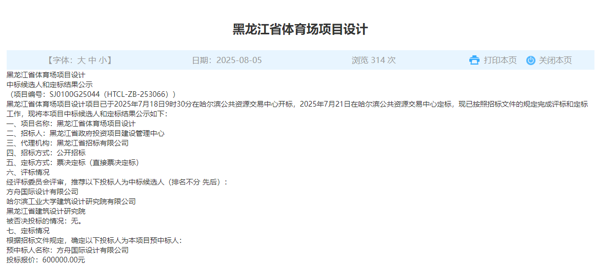 2025年8月5日,黑龙江省体育场项目设计招标结果显示,方舟国际设计有限公司以600000元的投标报价成为预中标人。项目设计服务期限为合同签订后50日历天。