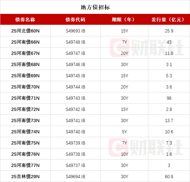 据财联社消息,今日将发行三批次地方债,包括河北、河南、吉林,具体如下: