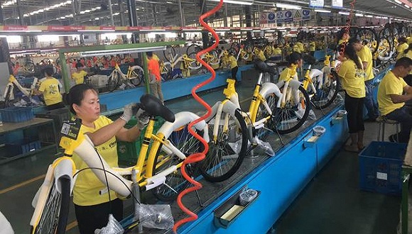 工人们说,这间厂房共6条生产线,若按照小时为单位,用订单数量相除,每15秒即可成功组装一辆ofo。