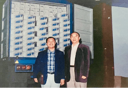 20世纪90年代初,满载"九生堂·三九蛋白肽口服液"的货柜车准备发车出口至香港。图右为邹远东教授,图左为香港商人、九生堂产品香港代理商郑荣成。