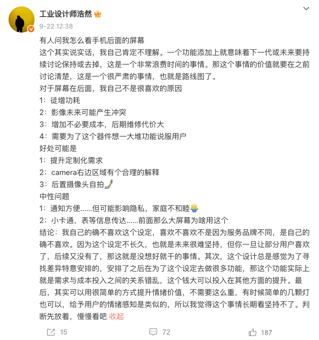 不止网友,手机行业的专业人士也谨慎看待背屏设计。2025年9月22日,OPPO工业设计中心总经理刘浩然在社交媒体平台发文,公开表达了自己对手机背屏的看法。刘浩然认为,手机背屏虽然拥有自拍清晰、满足定制化需求等优点,但也有徒增功耗、维修成本大、限制影像发展等问题。