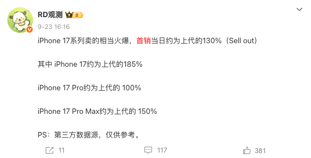 因升级幅度巨大,基础款iPhone 17成为了市场的宠儿。RD观测披露的数据显示,2025年9月19日首销当日,iPhone 17系列销量约为上代的130%,其中基础款iPhone 17销量约为上代的185%。