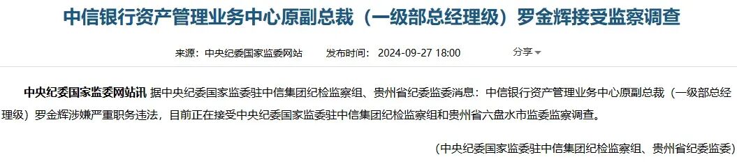 2024年9月27日,根据中央纪委国家监委网站发布的消息,中信银行资产管理业务中心原副总裁(一级部总经理级)罗金辉涉嫌严重职务违法,正在接受中央纪委国家监委驻中信集团纪检监察组和贵州省六盘水市监委监察调查。