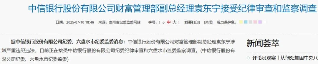 根据7月10日贵州省纪委监委网站发布的公告,中信银行财富管理部副总经理袁东宁涉嫌严重违纪违法,目前正在接受中信银行纪委纪律审查和六盘水市监委监察调查。