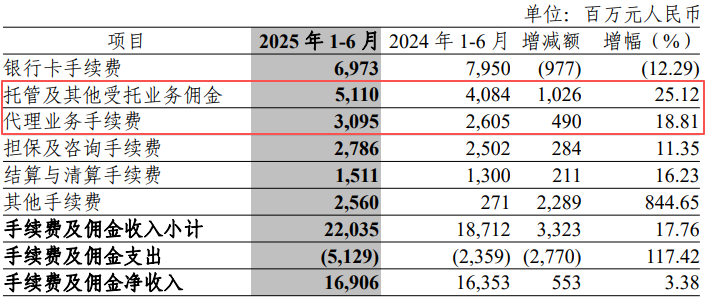 不过今年托管及其他受托业务佣金、代理业务手续费均迎来增长,上半年分别为51.1亿元、30.95亿元,同比分别增长25.12%、18.81%。资本市场持续升温,为财富管理业务带来了增长动能,驱动受托与代理业务手续费收入显著提升。