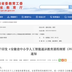 据安徽省教育厅门户网站消息,近日安徽省教育厅印发了《安徽省中小学人工智能通识教育课程纲要(2025年版)》。明确提出,自本学期开始,在安徽省各地小学三、四、五、六年级,初中七、八年级,高中高一、高二共8个年级独立开设人工智能通识教育课程,每个年级不少于8课时。课程将以培养学生人工智能素养为核心,将帮助同学们形成知识、技能、思维与价值观有机融合的关键能力和必备品格。