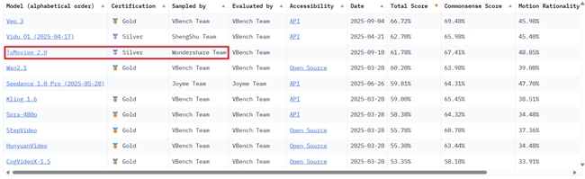 近日,大模型评测平台VBench重磅发布文生视频大模型全球评测榜单VBench-2.0。AIGC软件A股上市公司万兴科技(300624.SZ)旗下音视频多媒体大模型ToMoviee 2.0 AI(万兴天幕2.0海外版)超越多个国内外知名大模型,综合得分位列全球TOP3,跻身全球第一梯队。值得注意的是,ToMoviee 2.0 AI在摄像机运动和运动合理性两项关键指标斩获全球第一,在常识一致性、可控性、物理规律模拟等八个维度位列全球第二,展现出其在全球文生视频领域的强大实力。