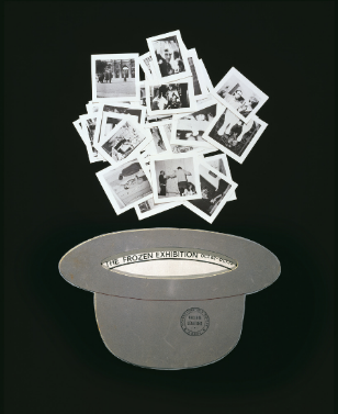 “偶然!激浪派!”展览第五章节名称“盒中之盒”(Boxes in the Boxes),是对当代艺术悖论的一则恰切隐喻。纳物箱、帽子是盒子,博物馆亦然。1962年,罗伯特·费列欧(Robert Filliou)将诸多小物件塞进贝雷帽,带着它行走于巴黎与伦敦的艺术节,宣称手中的贝雷帽是一座移动的博物馆。便携的盒子是对美术馆盒式空间的反讽重构,吊诡的是,当离开艺术节现场,充满批判意味的“小盒子”不能避免被收入美术馆“大盒子”中的命运。