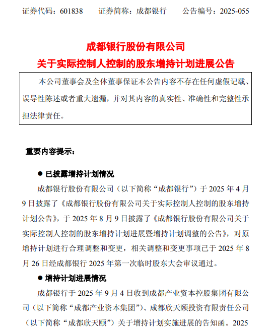 自2025年8月27日至9月4日,成都产业资本集团通过集中竞价方式累计增持成都银行股份4,775,500股,占成都银行股份总数的比例为0.1127%,增持金额达8700.10万元。成都欣天颐累计增持4,364,492股,占成都银行股份总数的比例为0.1030%,增持金额为7959.35万元。