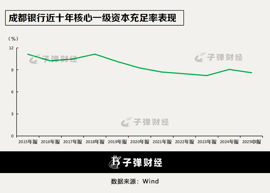 以成都银行核心一级资本充足率为例,2018年该行上市时为11.14%,此后一路下滑至2023年的8.22%,经历2024年的短暂上升后,2025年6月又回落至8.61%,下降0.45个百分点。