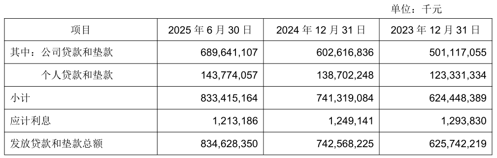 在存款端,截至2025年6月末,成都银行的对公贷款及垫款总额为6896.41亿元,占比达82.62%,而个人贷款及垫款总额为1437.74亿元,占比为17.23%。