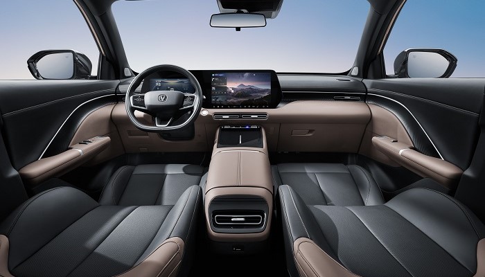 车内配备三辐式方向盘、8.88英寸液晶仪表、12.8英寸悬浮中控屏及怀挡机构,提供双色内饰选择。配置方面标配倒车影像、定速巡航、仿皮座椅和6扬声器音响,高配车型增加全景影像、主驾电动调节、前排座椅加热及外后视镜电动折叠等功能。副仪表台区域配备50瓦手机无线快充及镂空储物空间。