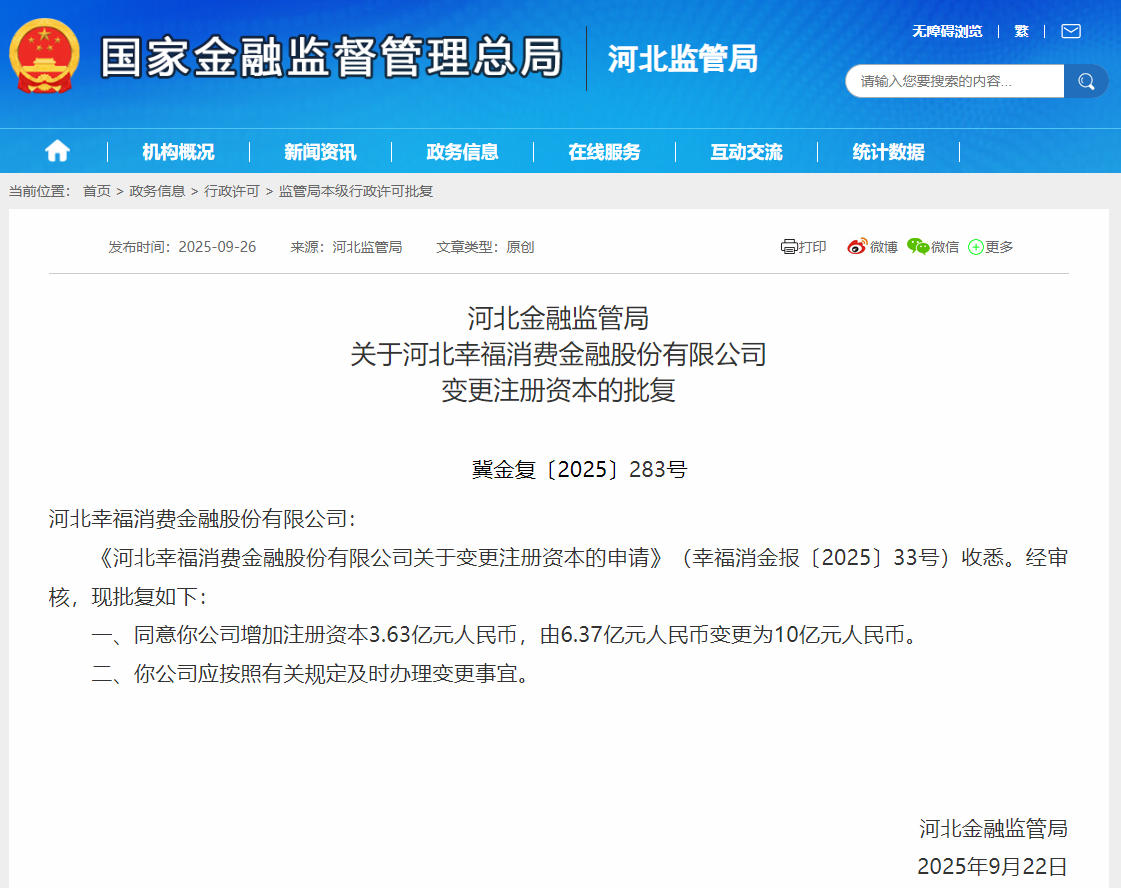 据国家金融监督管理总局的批复文件显示,河北金融监管局同意河北幸福消费金融股份有限公司(简称“河北幸福消费金融”)增加注册资本3.63亿元,由6.37亿元变更为10亿元。