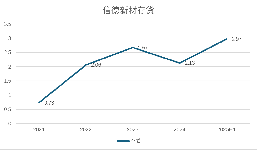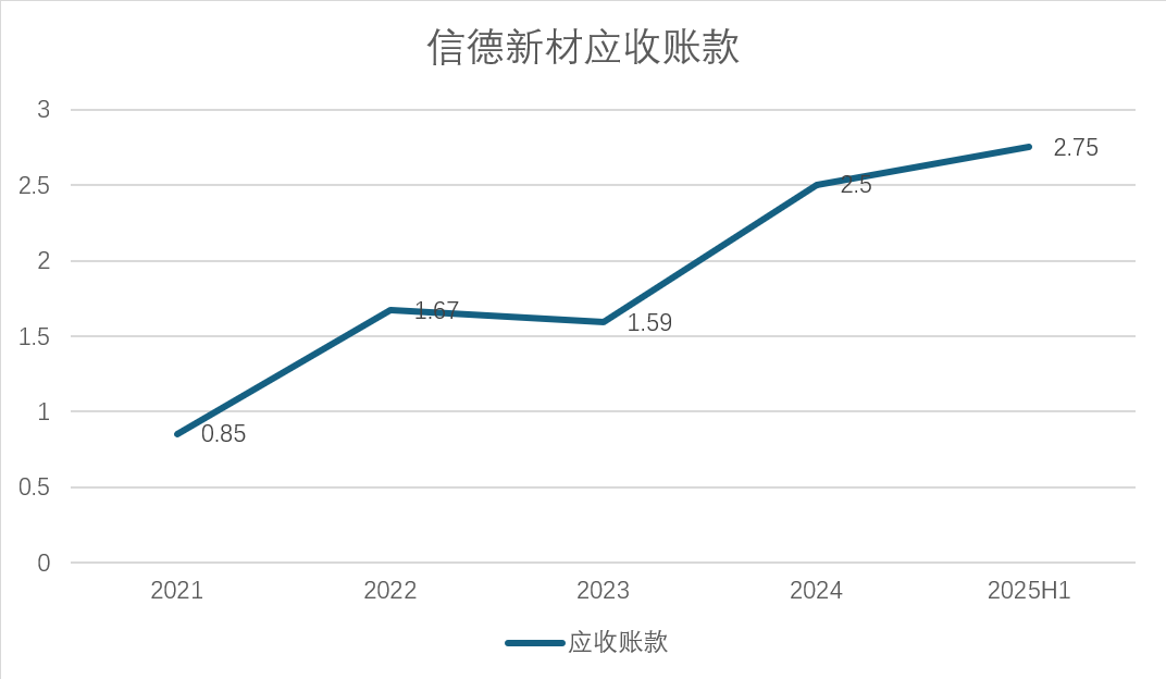 截至 2025 年6月末,信德新材存货余额高达 2.97 亿元,相较于 2024 年底的 2.1 亿元,环比增长 41%;应收账款余额达 2.75 亿元,同比增长 65%,增速远超同期营收 41.31% 的增幅,两者呈现明显的 “不匹配”。