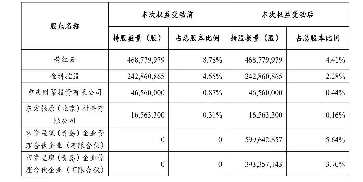 而在本次过户完成后,金科股份控股股东正式由金科控股变更为京渝星筑和京渝星璨,实际控制人则由创始人黄红云变更为无实际控制人。此举意味着黄红云正式退出对金科的实际掌控。