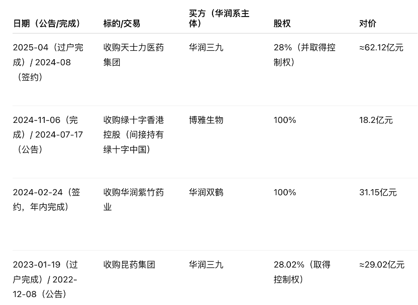2024年11月,华润医药旗下博雅生物以18.20亿元收购绿十字香港100.00%股权的交易完成交割纳入合并报表;2025年3月,控股子公司华润三九斥资62.12亿元受让天士力医药28.00%股份,触发控制权变更并且并表;同期公司通过产权交易所摘牌取得四川南格尔生物科技有限公司控制权(合计持有约72.00%表决权),布局血液采集设备与耗材领域。