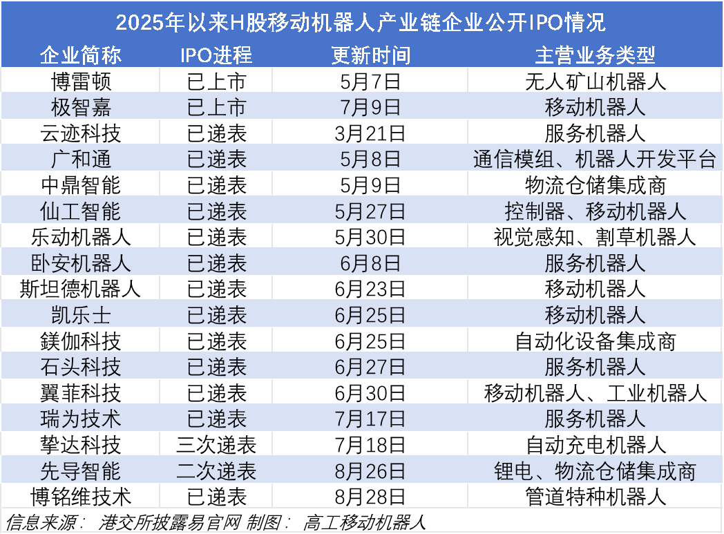 今年以来,多家机器人领域公司冲刺港交所。据高工机器人统计,截至2025年九月初,今年已有15家移动机器人产业链企业公开向港交所递表,申请赴港上市。