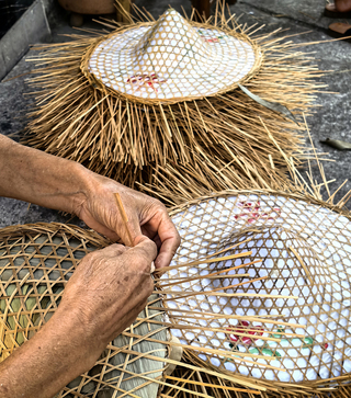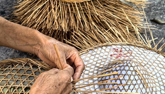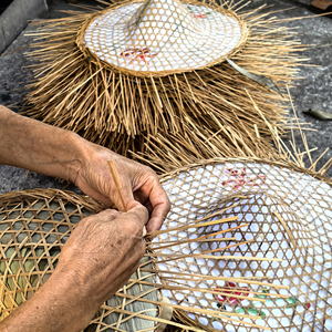 2025年8月20日,浙江省丽水市缙云县壶镇南顿村,72岁的蔡茂勤夫妻在编织斗笠。(图片来源:视觉中国)