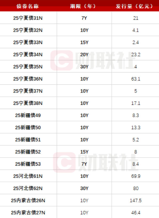 据财联社消息,今日将发行四批次地方债,包括宁夏、新疆、河北、内蒙古,具体如下: