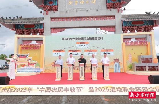 活动现场还进行了新会陈皮全产业链银行金融服务合作、2025年新会柑/新会陈皮产销合作、大型渠道新会陈皮采购等签约,打通陈皮村从柑果种植到陈皮销售,再到金融赋能的关键链路。