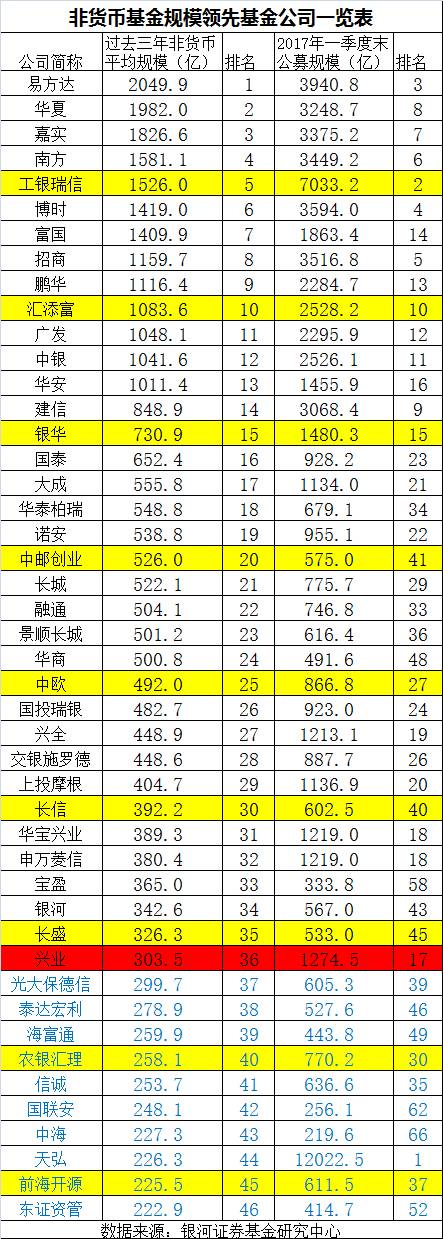 刚刚300亿元门槛两家基金公司分别为长盛和兴业基金公司,过去三年非货币基金平均规模分别为326.3亿元和303.5亿元。