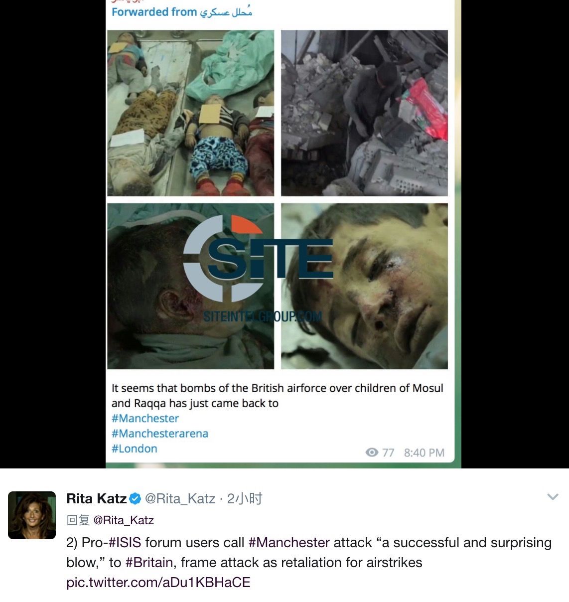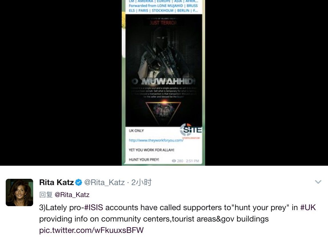 赛德情报集团负责人Rite Katz跟踪“伊斯兰国”极端组织社交账号发现,在曼彻斯特爆炸事件发生后,该社交账户发文庆祝“爆炸成功”,并表示爆炸是为报复英国空军在伊拉克摩苏尔和拉卡的空袭。