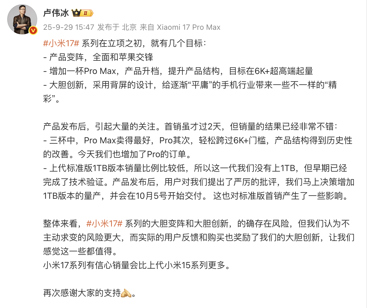9月29日下午,小米集团总裁卢伟冰在社交平台发文称,小米17系列有信心销量会比上代小米15系列更多。卢伟冰透露,小米17 Pro Max卖得最好,Pro其次,今天也增加了Pro的订单。此外,标准版1TB版本会在10月5日开始交付。