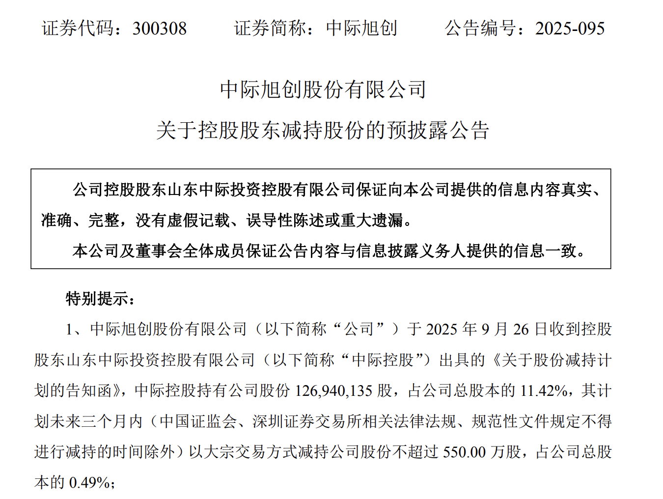 近日,中际旭创(300308.SZ)控股股东山东中际投资控股有限公司的一纸减持公告,在资本市场引发广泛关注。根据深交所发布的公告,中际控股计划未来三个月内以大宗交易方式减持公司股份不超过550万股,占公司总股本的0.49%。