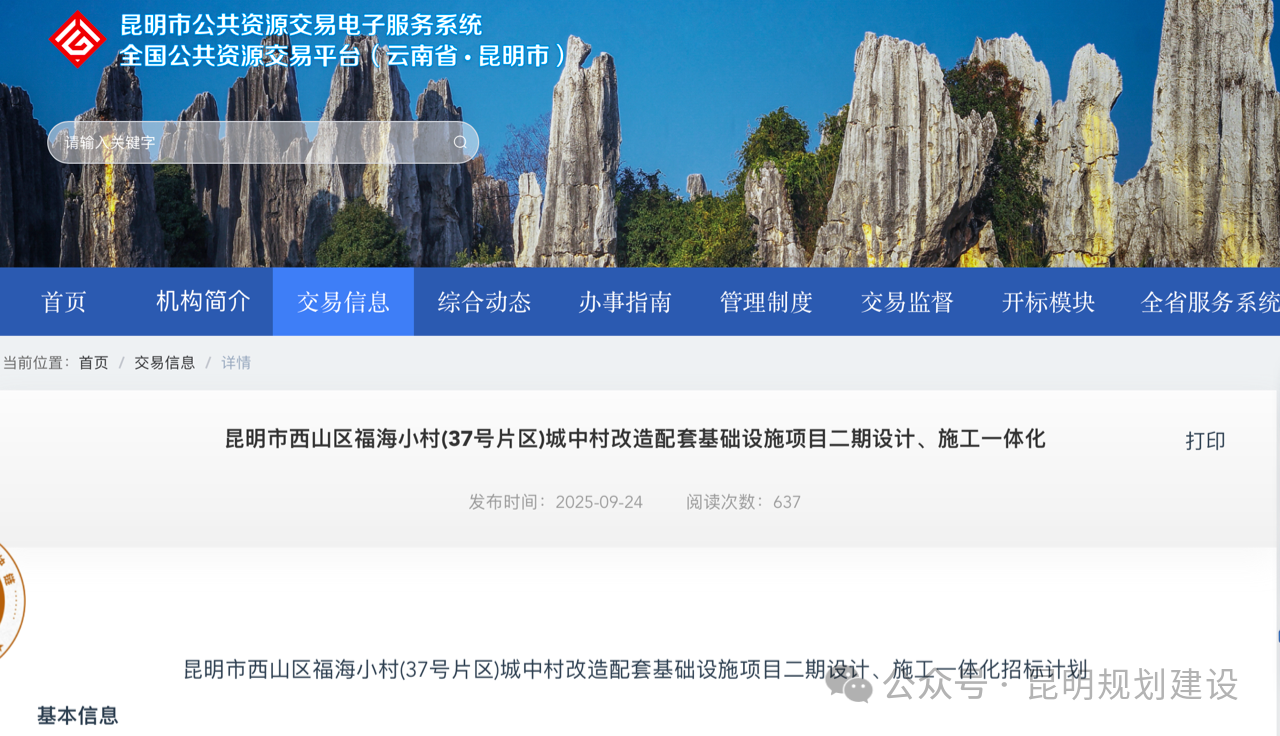 昆明市公共资源交易中心发布西山区福海小村(37号片区)城中村改造配套基础设施项目二期多项招标计划,涵盖设计施工、监理服务、造价咨询等环节,总投资超3.1亿元。