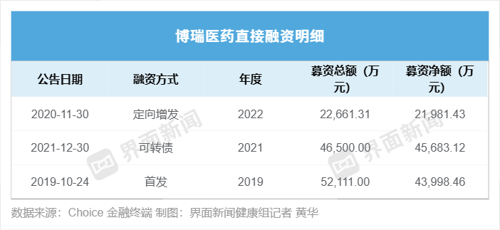 从融资频率上来看,博瑞医药在刚上市的几年内融资频率不低。据Choice金融终端提示,除了2019年首发的5亿元之外,企业在2021年和2022年分别有可转债和定向增发,数额分别为4.6亿元和2.3亿元。