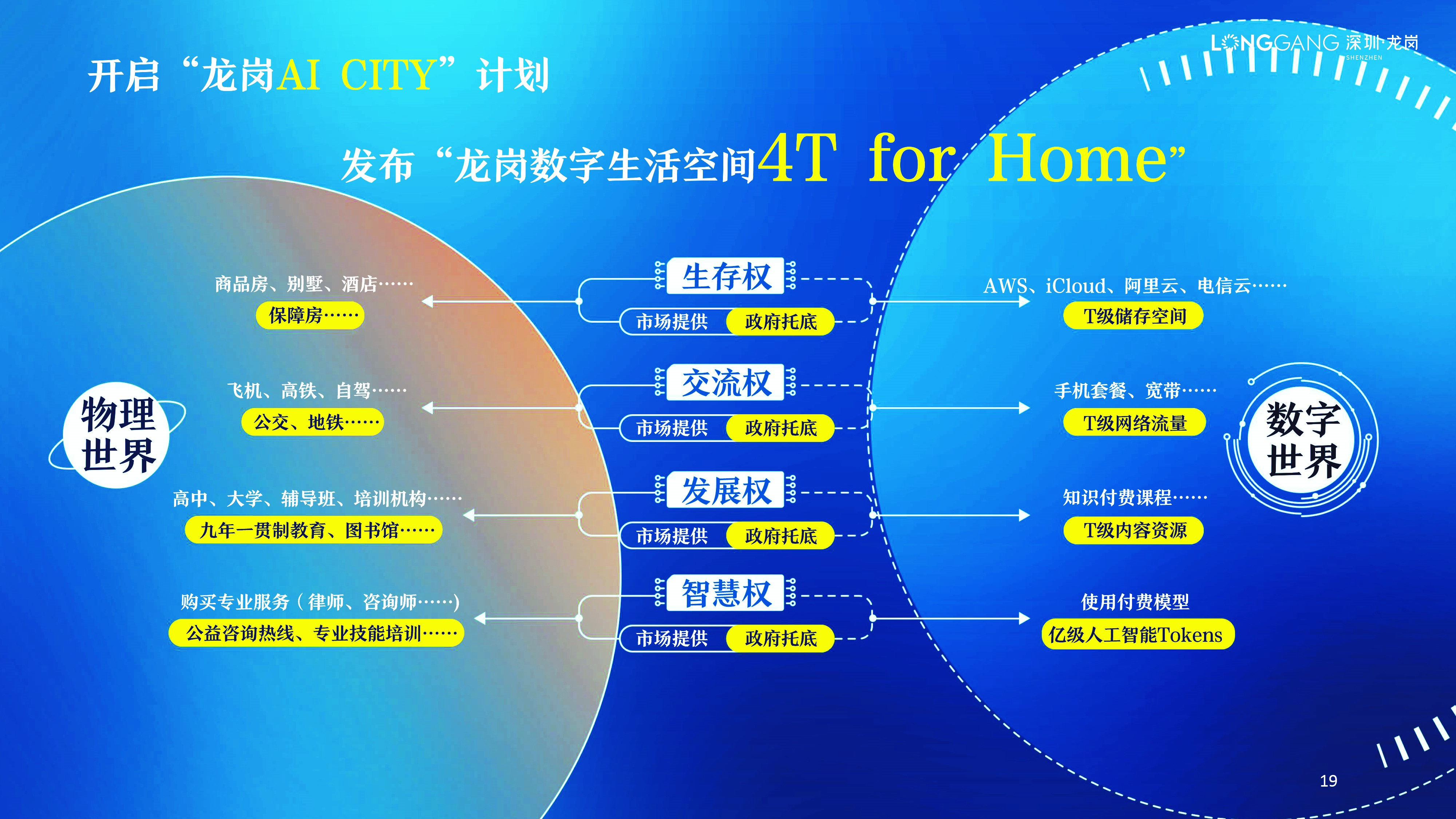 前文提出的“数字平权”理念,已经被龙岗具体落地为“4T数字生活空间”,将理念转化为居民可感知的公共服务,把公民在物理世界的基本权利,量化成具体的数字资源: