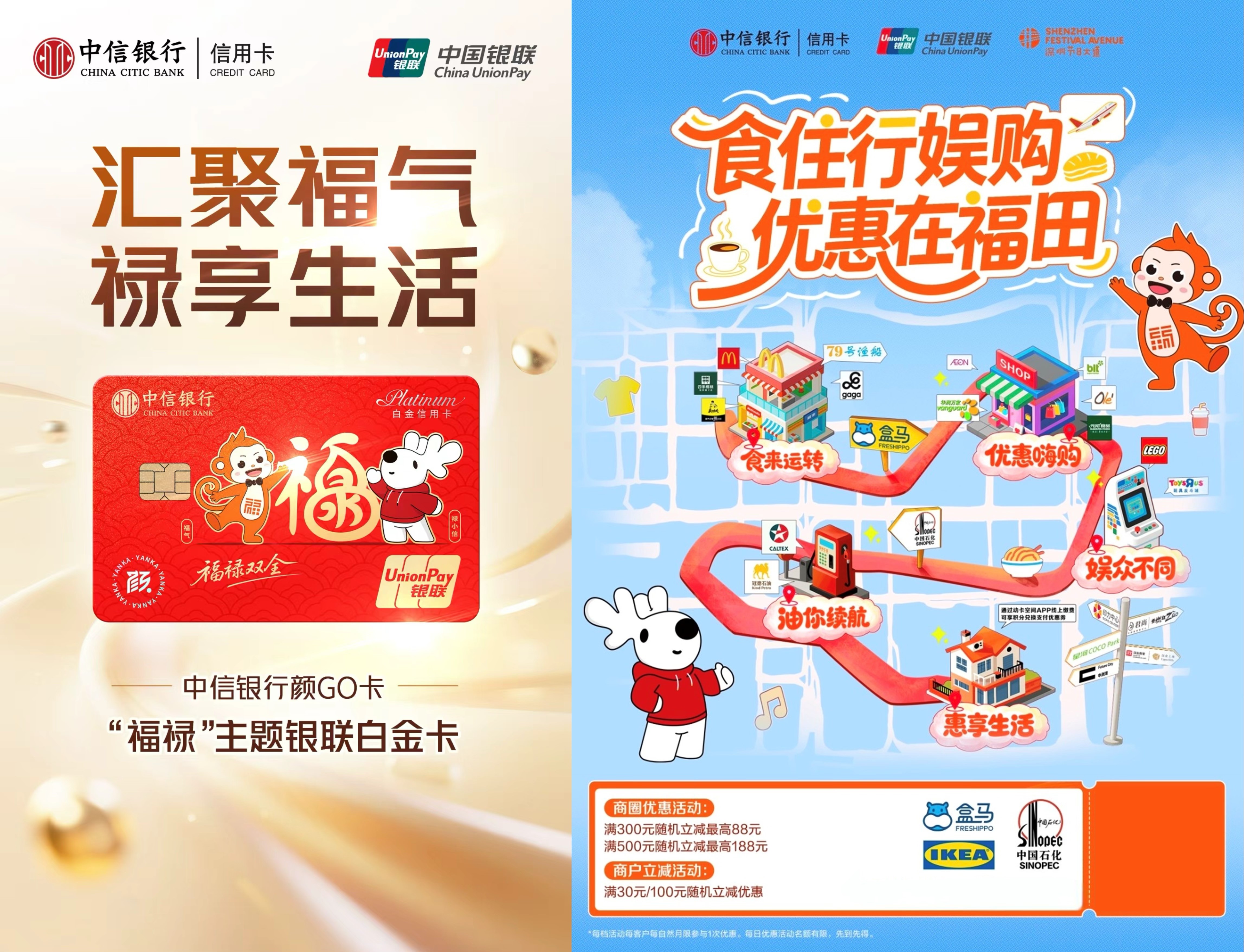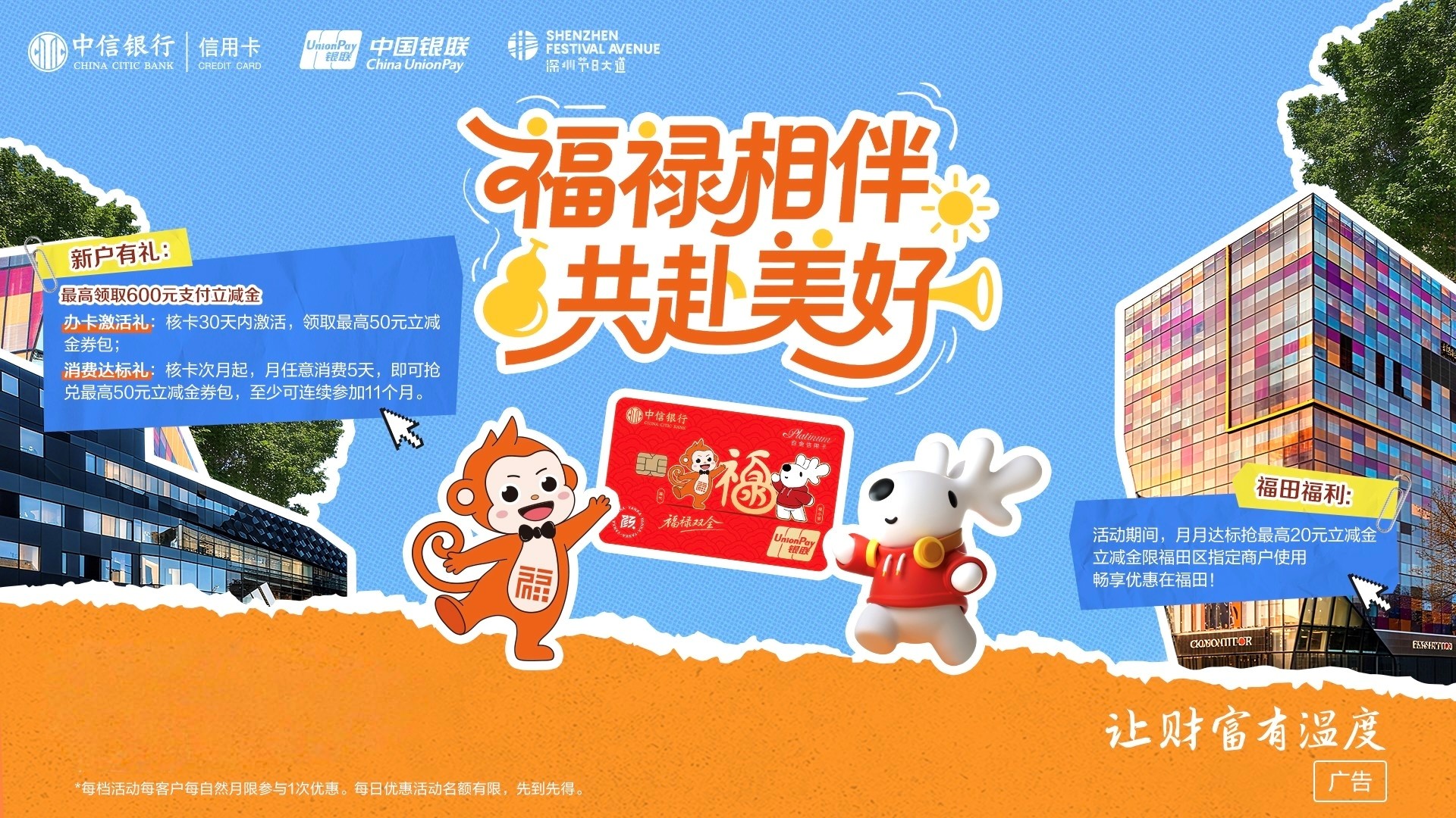 据介绍,中信银行颜 GO 卡福禄主题银联信用卡结合当下用户“实惠优先”的消费需求,推出系列特色权益,旨在成为消费者的“省钱好帮手”,具体包括:新用户开卡即可获赠50元立减金券包,每月消费达标还可再领取 50 元立减金券包,全年最高享600元立减金;活动期间每月消费达标还可抢福田区指定商户最高20元消费立减金,覆盖超市商场、美食餐饮、娱乐生活等多元商户,让持卡人切身感受城市“烟火气”,进一步点燃双节消费热情,共赴美好生活。