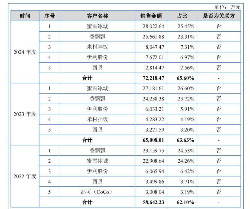 不过,新天力的客户结构呈现出高度集中化特征。2022年至2024年间,公司前两大客户,蜜雪冰城和香飘飘的合计销售占比始终维持在近50%左右,形成了“半壁江山依赖两家”的局面。