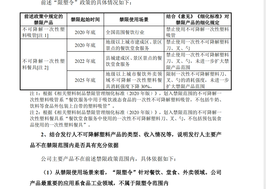 对此,公司曾在问询函里表示,从禁限使用场景来看,“限塑令”针对餐饮、堂食、外卖领域。公司产品最重要的应用系食品工业领域,不属于限塑令范围内。
