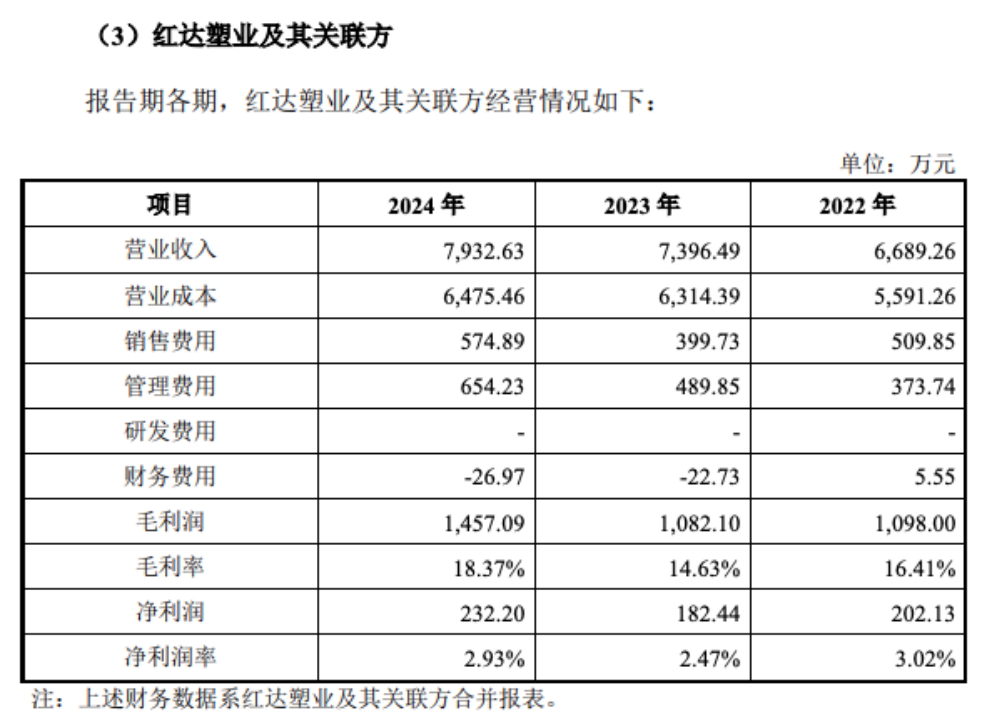 何麟君的兄弟何麟彬及其配偶控制了3家企业。其中,浙江红达塑业股份有限公司及其全资子公司台州市椒江红达塑业有限公司主要从事生产和销售一次性餐饮塑料杯、纸杯和打包碗。2022年-2024年,红达塑业的营收分别为6689.26万元、7396.49万元和7932.63万元。