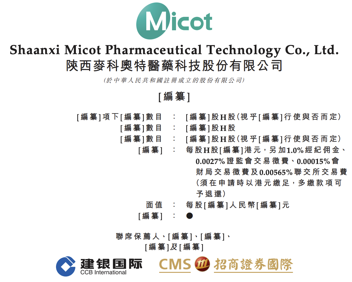 据港交所文件,9月29日,陕西麦科奥特医药科技股份有限公司向港交所提交上市申请书,联席保荐人为建银国际、招商证券国际。
