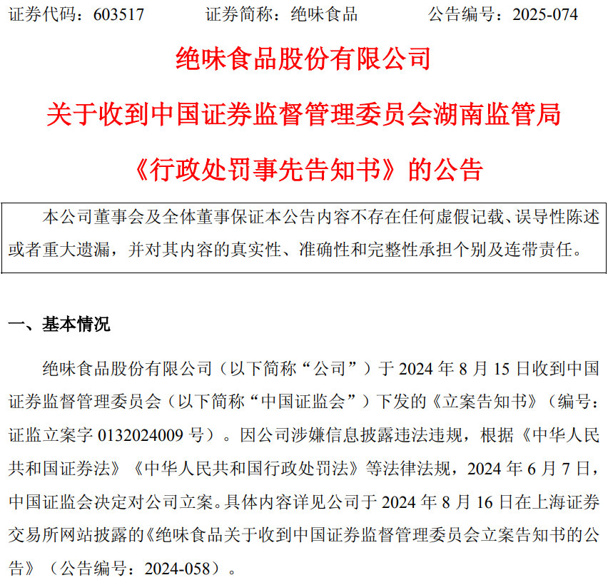 中国证监会湖南监管局决定对绝味食品责令改正、给予警告,并处以400万元罚款;