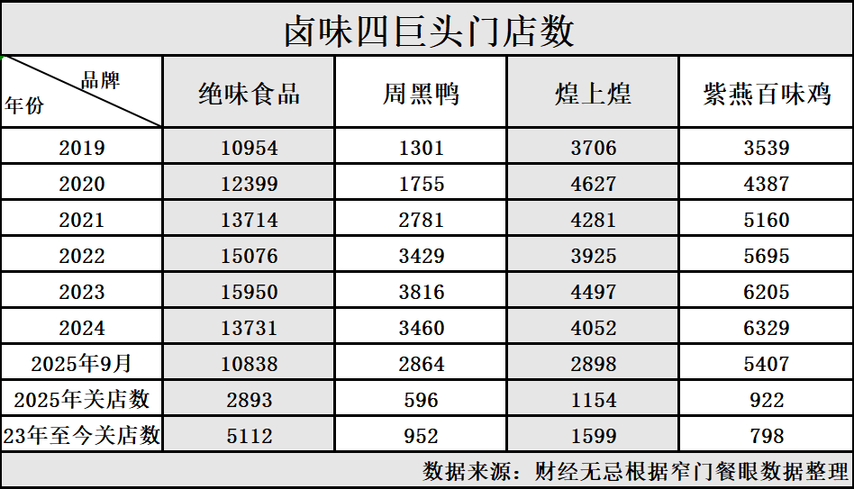 而同一时期的周黑鸭、煌上煌和紫燕百味鸡,各关店952家店、1599家店、798家店,四家卤味巨头,合计关店8461家。