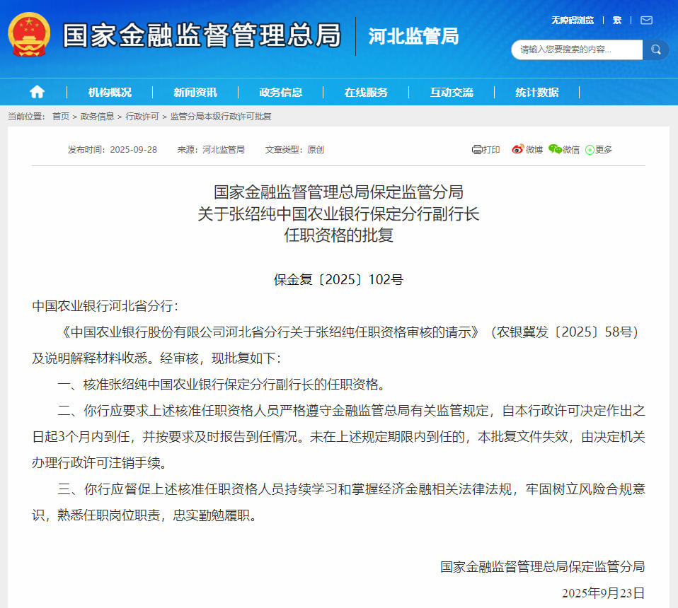 据国家金融监督管理总局河北监管局的批复文件显示,保定监管分局核准张绍纯中国农业银行保定分行副行长的任职资格。