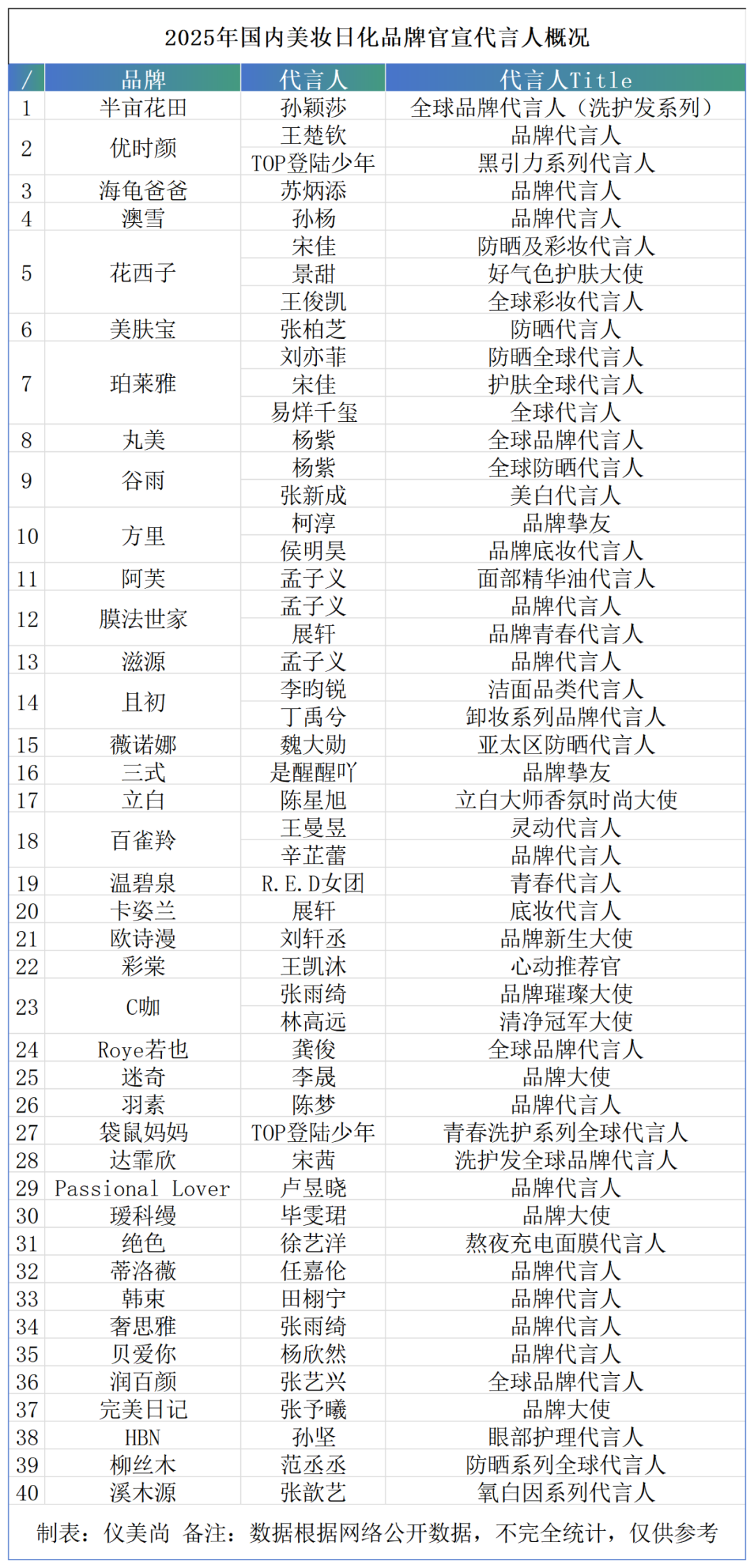 不同代言人的Title,还能反映品牌的战略意图,这在国货品牌中尤为显著。仪美尚分析发现,国内美妆品牌一共有7个品牌为其代言人赋予了“全球”头衔,包括半亩花田、花西子、珀莱雅、丸美、谷雨、若也和润百颜。