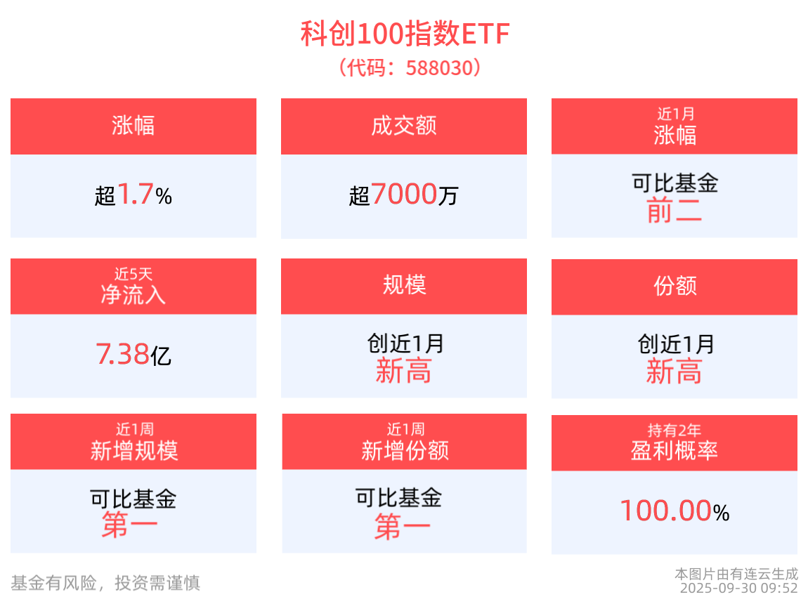 流动性方面,科创100指数ETF盘中换手1.07%,成交7657.32万元。拉长时间看,截至9月29日,科创100指数ETF近1年日均成交4.43亿元,排名可比基金第一。