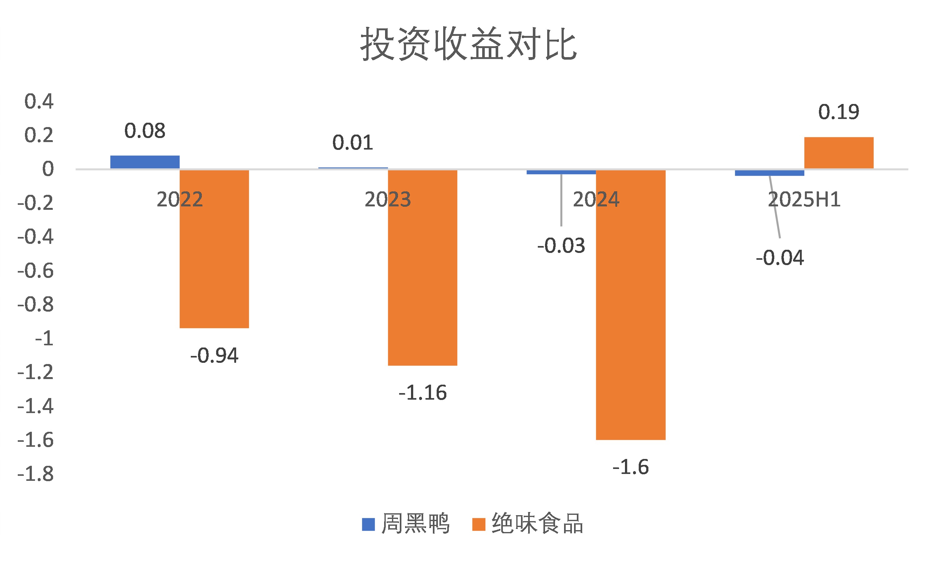 这种聚焦策略有效控制了风险。周黑鸭直到今年上半年才出现投资活动现金流净流出,为1.58亿元,此前多年均保持净流入。权益性投资收益方面, 2024年亏损349万元,今年上半年亏损398万元,规模为ST绝味的零头。