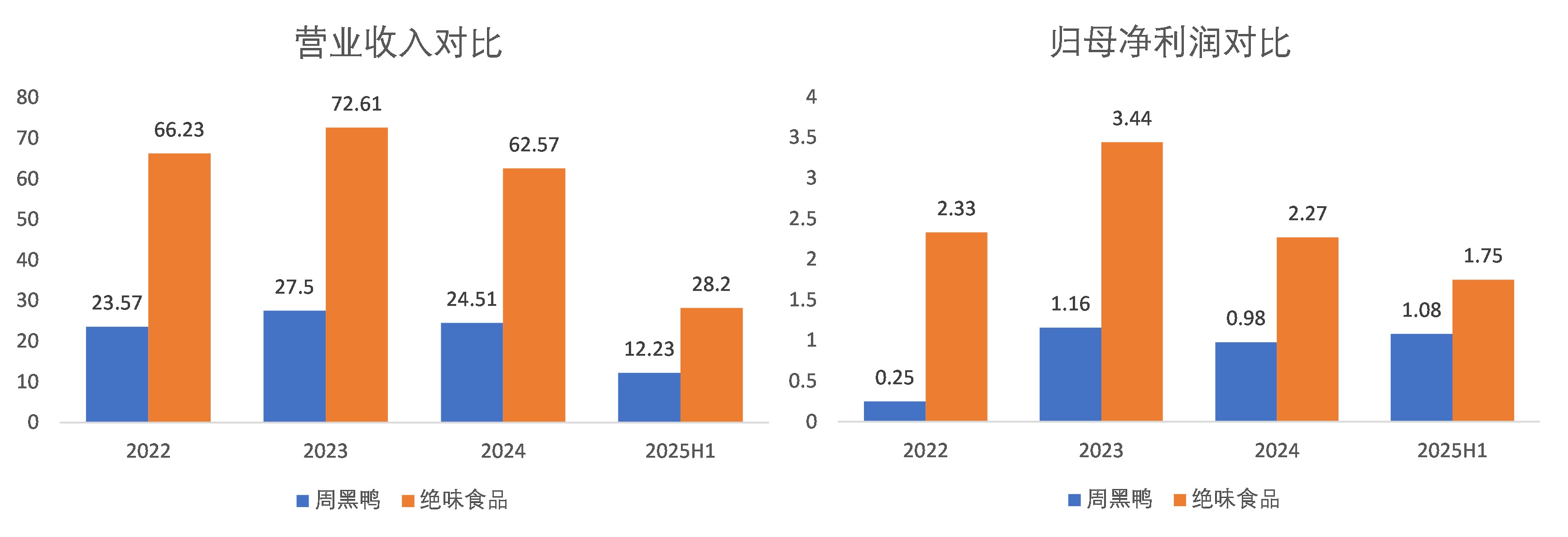 比较来看,2025年上半年,ST绝味营收28.2亿元,同比下降15.6%;归母净利润1.75亿元,同比下降 40.7%;门店一年锐减超5000 家,规模效应减弱拖累盈利。周黑鸭营收12.2亿元,降幅2.9%。周黑鸭门店总数为2864家,虽数量仅为绝味的四分之一,却实现了1.08亿元净利润,同比增长228%。