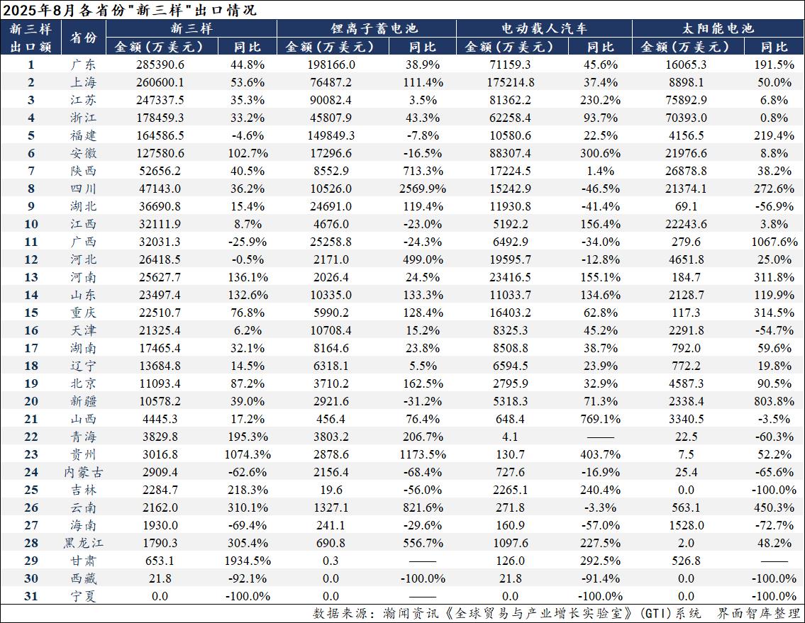 【编者按】为了更全面、更及时、更精确地反映“新三样”产品的出口状况,2025年3月起,界面新闻/界面智库和瀚闻资讯联合推出《中国“新三样”出海月报》。《中国“新三样”出海月报》旨在呈现全国及各省“新三样”产品出口金额、出口数量和出口目的地等指标的月度变化趋势,以期为政府、企业和投资者等提供决策参考。我们将于每月27日左右发布相关月报。